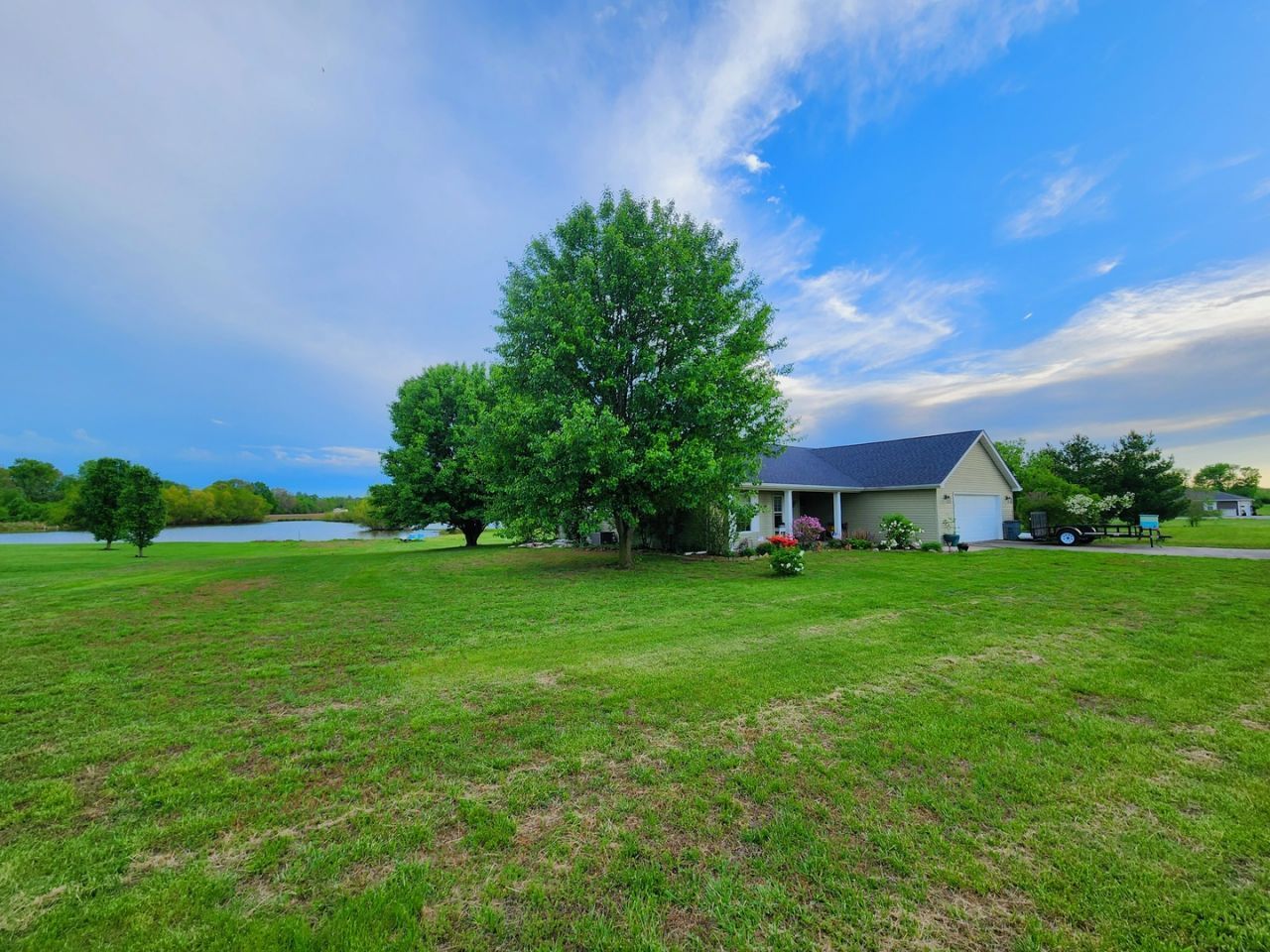 Step into a sanctuary where modern design meets the tranquility of nature. This is a custom-built, single-owner home, tucked away in the sought-after Hanover Place subdivision overlooking Lake Hanover, and every detail has been curated for comfort, beauty, and accessibility! Storage is a priority here, featuring an attic above the garage, a convenient mudroom transition into the kitchen, a large pantry, oversized entry and bedroom closets, and a walk-in closet in the primary suite. From the vaulted ceilings and breathtaking views, to the zero-step entry, oversized attached 3-car garage, and 36-inch doorways throughout, this gem offers a seamless blend of style and ease. The real magic happens outside. Your private backyard is a lush escape, filled with vibrant perennials and established fruit trees and bushes including apples, peaches, plums, and blueberries. Thanks to the active bee hives, the garden is a thriving ecosystem, with tiny new fruits already appearing this spring. Sip your morning coffee on the covered back porch or retreat to the screened gazebo to watch the breeze catch the willow trees along the edge of Lake Hanover. With recent updates including a new roof, new appliances, new flooring and fresh paint throughout, and a newly remodeled primary bathroom with a walk-in shower and custom glass, the only thing left to do is move in and enjoy the view. Don't miss this one-of-a-kind lakeside sanctuary!